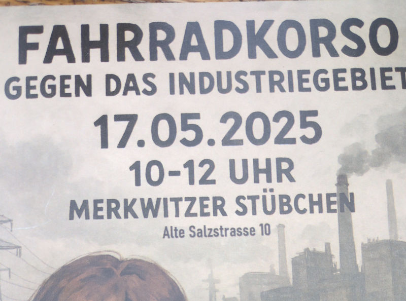 Hinweis: Am Samstag, dem 17.5. findet von 10-12 Uhr ein Fahrradkorso gegen das Industriegebiet in Merkwitz statt.